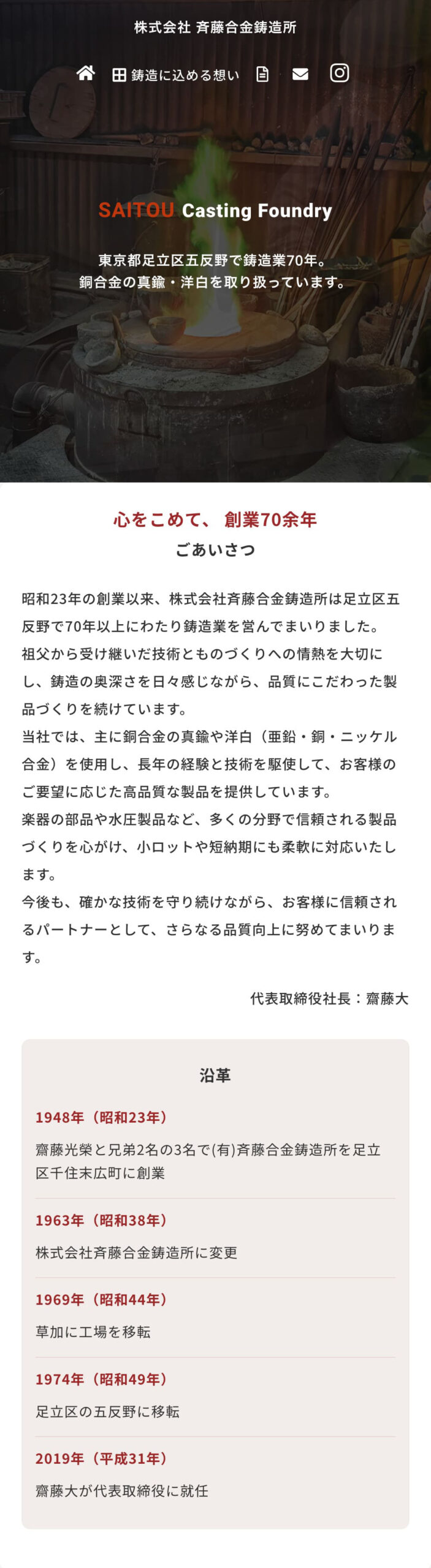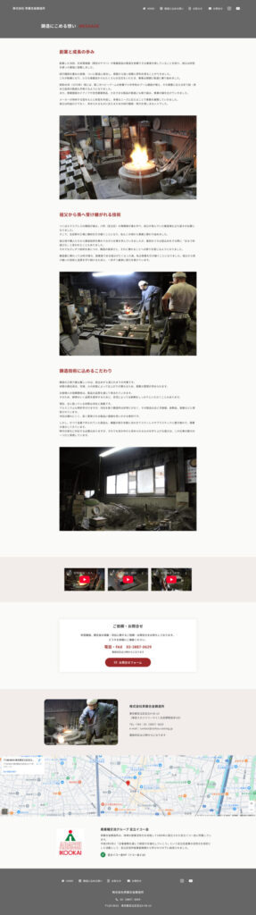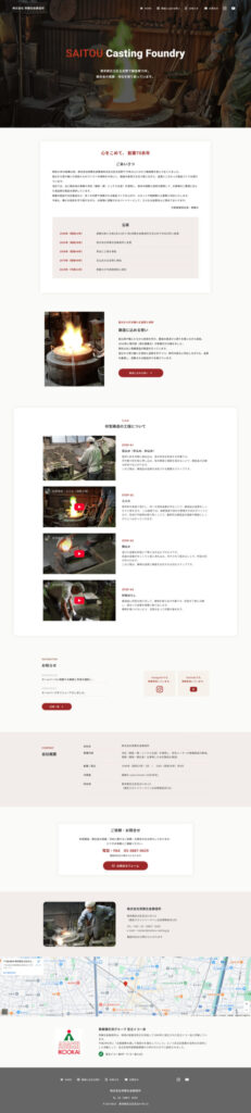 テンプレート(アトリエライトの自作です)をベースにノーコードによるサイト構築をすることで、制作費用を削減。 集客メインの構成ではなく、企業と事業(砂型鋳造)のブランド(信頼と価値)を実直に伝えることを主軸に、構成をご提案させていただきました。 信頼感と価値は、創業70年以上の歴史と技術の継承を「鋳造にこめる想い」としてメッセージを掲載いたしました。 砂型鋳造の技術・専門性の発進として、視覚的に直感で認識いただけるように、作業場の撮影(写真・動画)をいたしました。